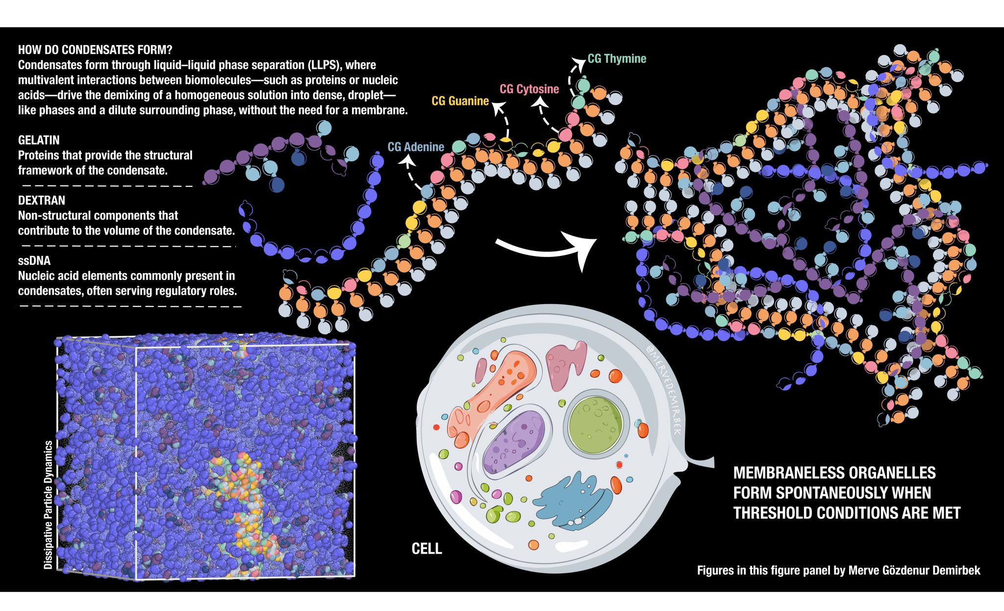 📸 This image illustrates the self-assembly of biomolecules into membraneless organelles through liquid-liquid phase separation, as modeled using coarse-grained simulations.